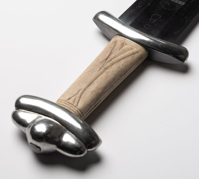 The hilt is made from iron with a tinned surface together with a grip made of whale bone with some simple patterns based on a surviving grip from Sweden.
